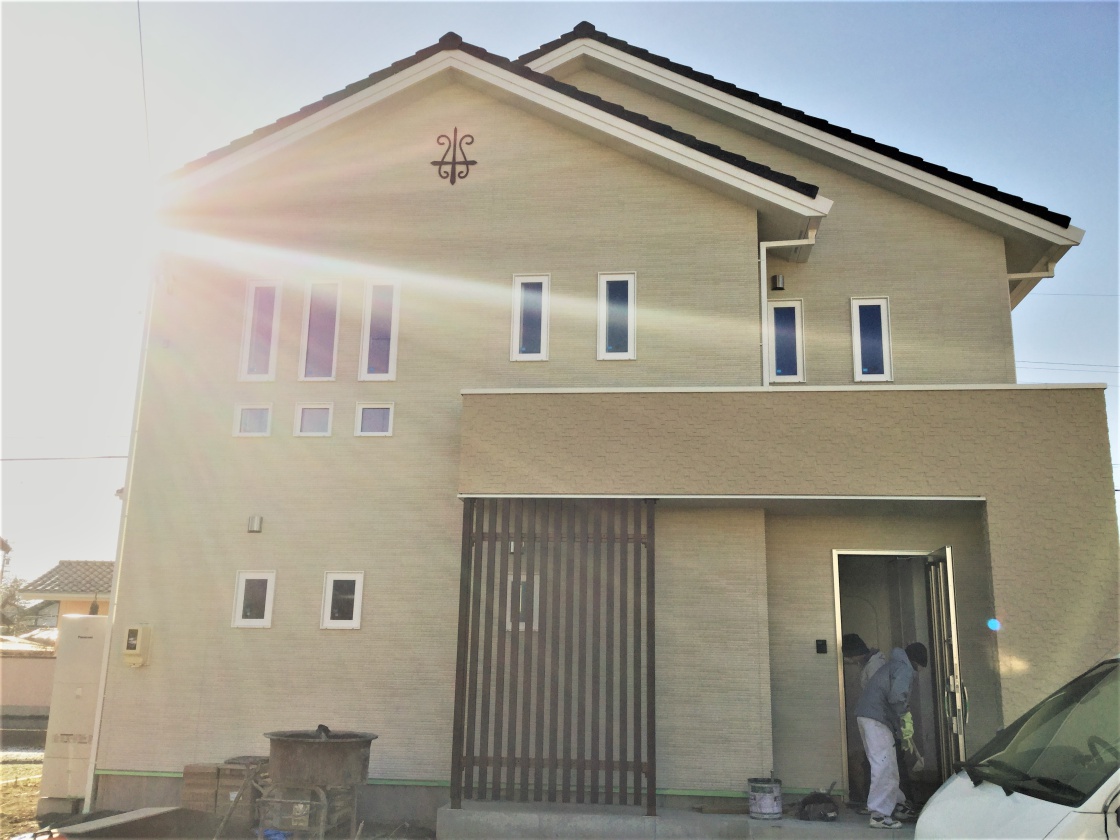 クリーム系の色味でまとめた外壁に、ダークブラウンの格子が程よいアクセントとなっているおうちです♪